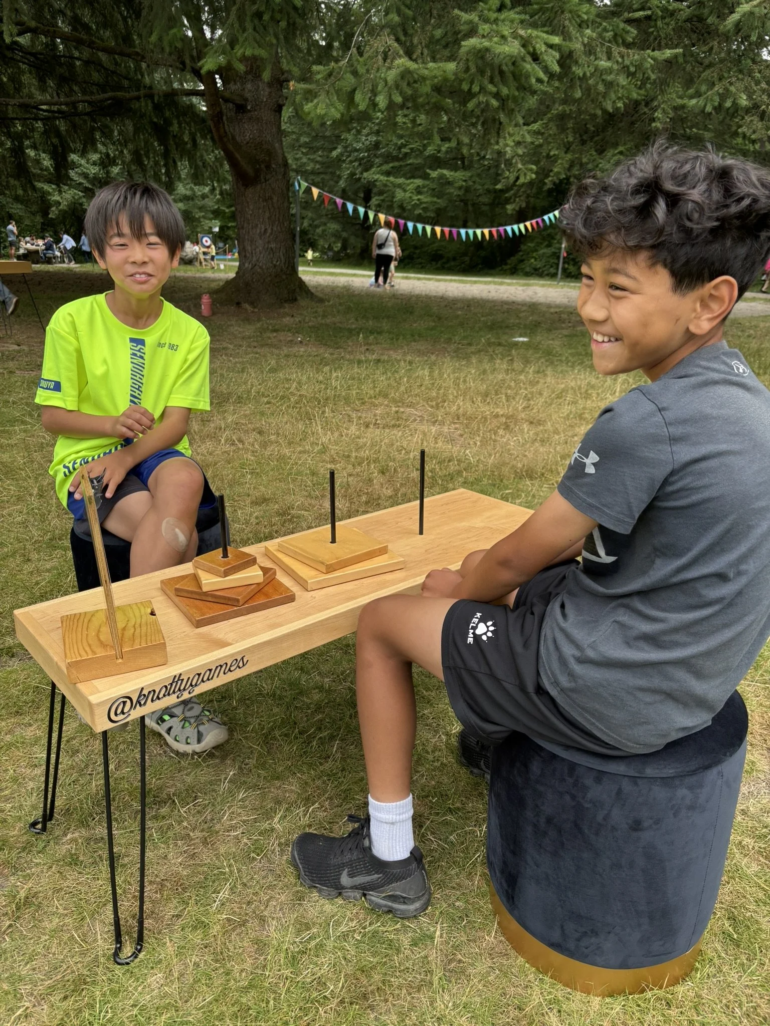 This game rental includes the Tower of Hanoi table, 7 discs, and 2 stools for guests to sit on while working through the game.